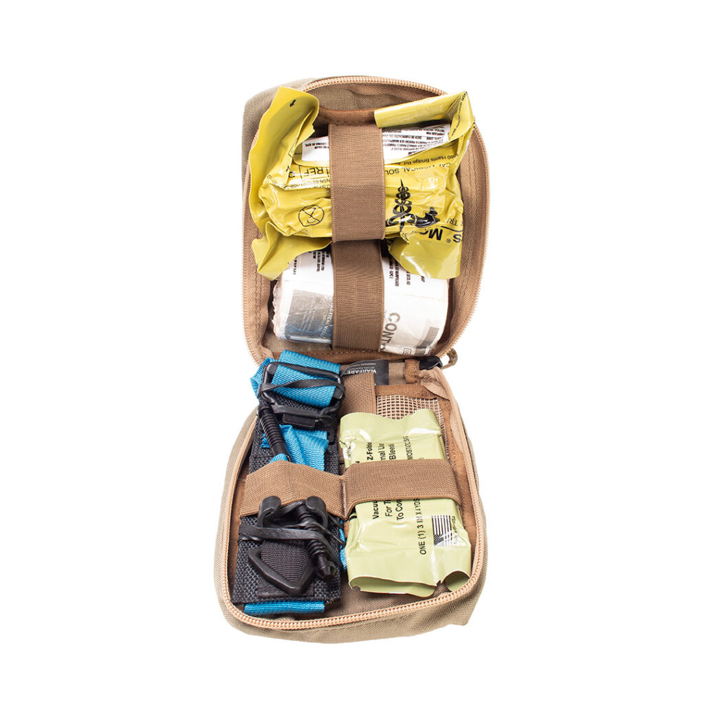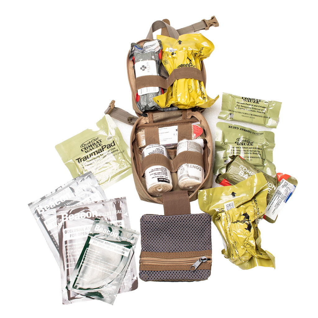 Um bom IFAK deve conter itens básicos e essenciais para o tratamento de ferimentos. Alguns dos componentes mais comuns incluem: